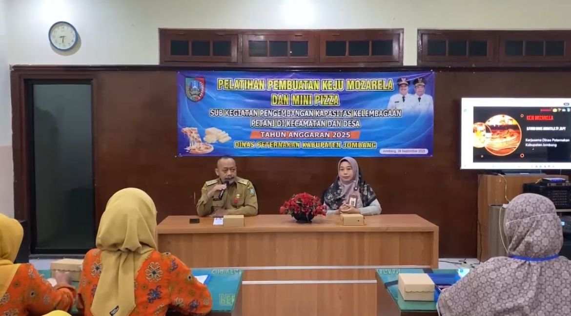 Jombang. Dinas Peternakan Kabupaten Jombang menyelenggarakan Pelatihan pembuatan Keju Mozzarella dan Mini Pizza yang bertempat di Ruang Rapat Ettawa dalam rangka Penguatan Ketahanan Pangan. Peserta yang mengikuti Pelatihan merupakan perwakilan dari 21 kecamatan sejumlah 42 orang.